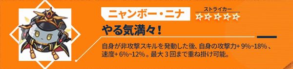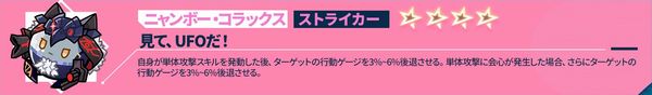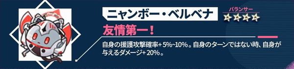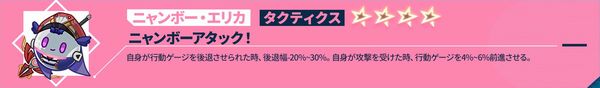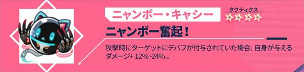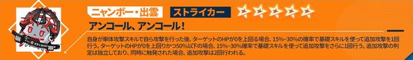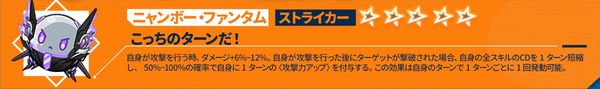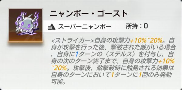 自身の攻撃力+10%~20%。自身が攻撃を行った後、撃破された敵がいる場合、自身に1ターンの<ステルス>を付与し、自身の次のターン終了まで、自身の攻撃力+10%~20%。攻撃後、敵撃破時に触発される効果は自身のターンにおいて1ターンに1回のみ発動可能。