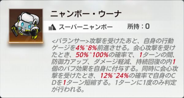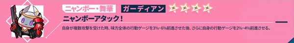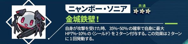 自身が攻撃を受けた時、35%~50%の確率で自身に最大HP7%~10%の<シールド>を2ターン付与する。この効果は2ターンに1回発動する。