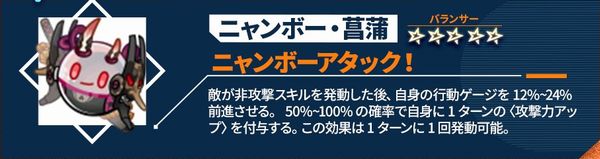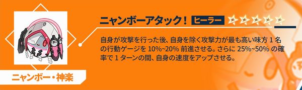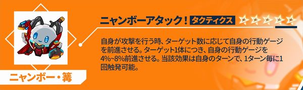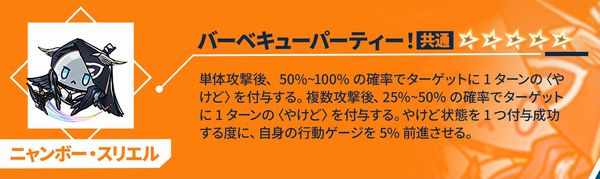 単体攻撃後、50%~100%の確率でターゲットに1ターンの<やけど>を付与する。複数攻撃後、25%~50%の確率でターゲットに1ターンの<やけど>を付与する。やけど状態を1つ付与成功する度に、自身の行動ゲージを5%前進させる。