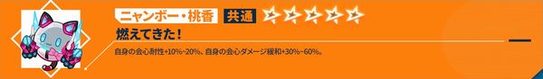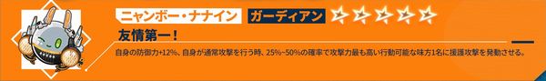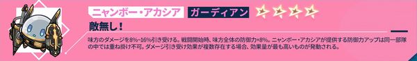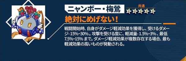 戦闘開始時、自身がダメージ軽減効果を獲得し、受けるダメージ-15%~30%。攻撃を受ける度に、軽減量-1.5%~3%、最低7.5%~15%まで。ダメージ軽減効果が複数存在する場合、最も軽減効果の高いものが発動される。