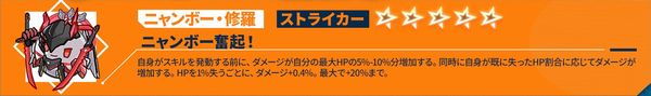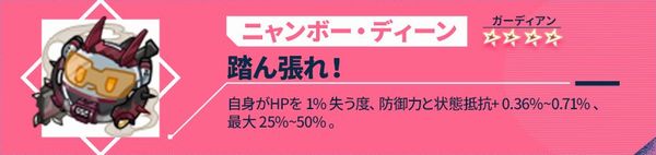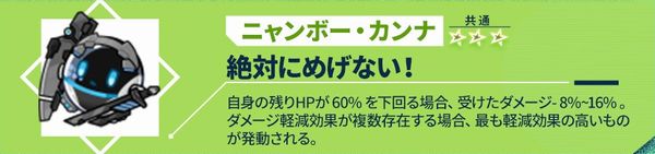 自身の残りHPが60%を下回る場合、受けたダメージ-8%~16%。ダメージ軽減効果が複数存在する場合、最も軽減効果の高いものが発動される。