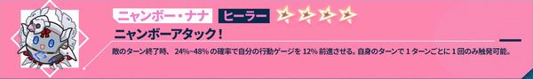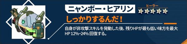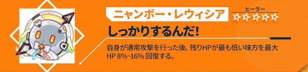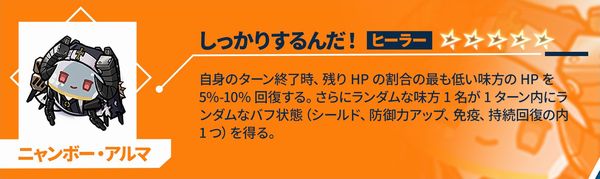 自身のターン開始時、自身のHPを最大4%~8%回復し、自身が1%のHPを失う度に、回復量+0.5%、最大50%まで。