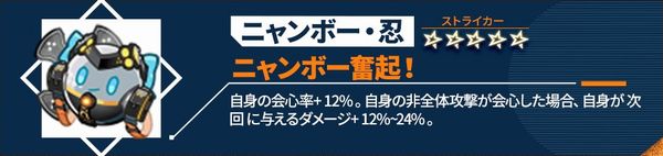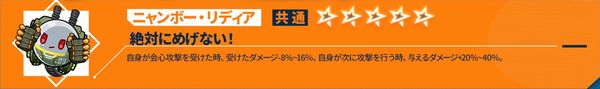 自身が会心攻撃を受けた時、受けたダメージ-8%~16%。自身が次に攻撃を行う時、与えるダメージ+20%~40%。