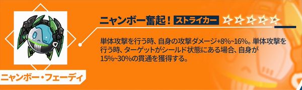 単体攻撃を行う時、自身の攻撃ダメージ+8%~16%。単体攻撃を行う時、ターゲットがシールド状態にある場合、自身が15%~30%の貫通を獲得する。